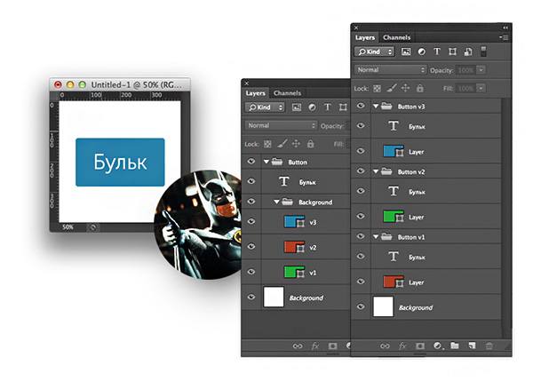 Thông thường có những trường hợp nhiều phiên bản khác nhau của một yếu tố được nằm trong cùng 1 file làm việc. Ví dụ như button của web, chúng ta sẽ có 3 phiên bản cho những trường hợp bình thường, hover và đã click, 3 phiên bản của button đó sẽ có 3 màu background khác nhau.
