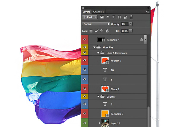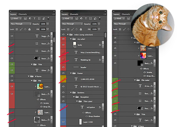Nhiều người đặt cho mỗi layer chứa các yếu tố tương tự nhau với một màu sắc giống nhau để dễ phân biệt. Ví dụ các layer text màu vàng, các layer hình ảnh màu tím, các layer shape màu xanh, v.v… Như vậy khi làm việc họ sẽ dễ dàng phân loại layer hơn.