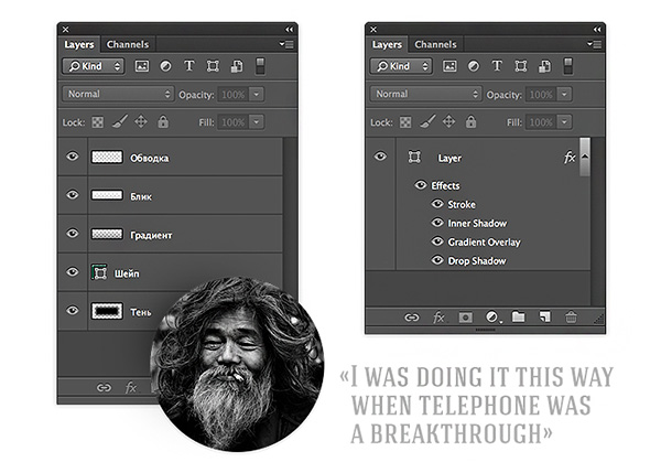 Ngày nay vẫn có không ít những designer thường theo lối cũ, sử dụng những hình ảnh bitmap (pixel) để làm chứ không sử dụng layer style hoặc smart object. Điều này rất khó để chỉnh sửa các yếu tố trong tương lai khi bạn muốn thay đổi cái gì đó ở chúng.