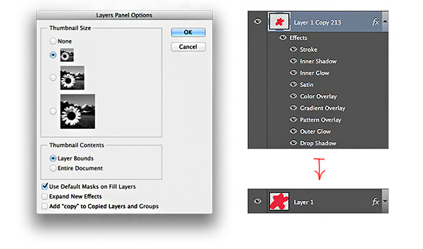 - Thumbnail Content : Thủ thuật này cho phép không phải hiển thị tất cả layer đó, mà chỉ hiển thị phần nội dung của nội dung của layer đó trên thumbnail, bỏ qua hết các khoảng trắng không cần thiết.