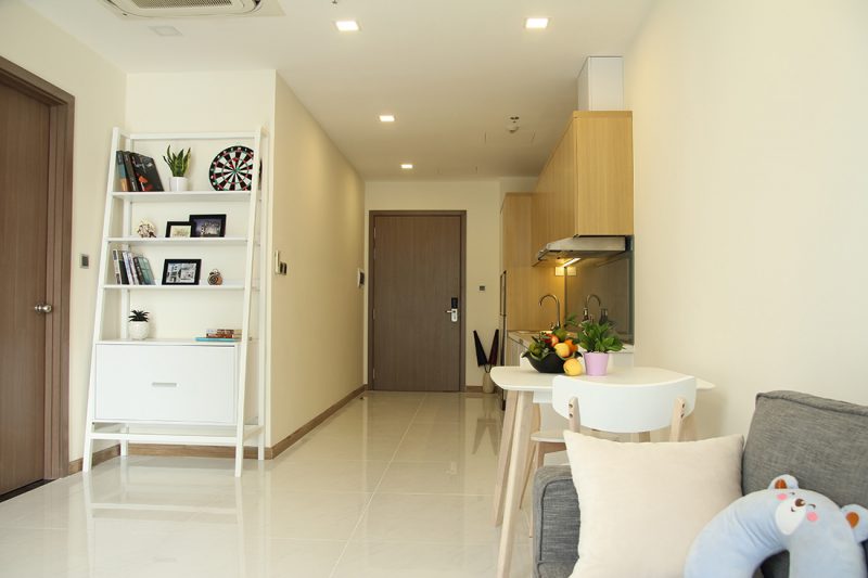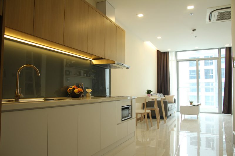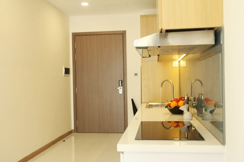 Với căn hộ thuộc loại cao cấp hàng đầu thì thiết kế nội thất cũng cần phải xứng tầm. Khu vực bếp nằm ở cửa ra vào được thiết kế sang trọng với các gam màu trung tính.
