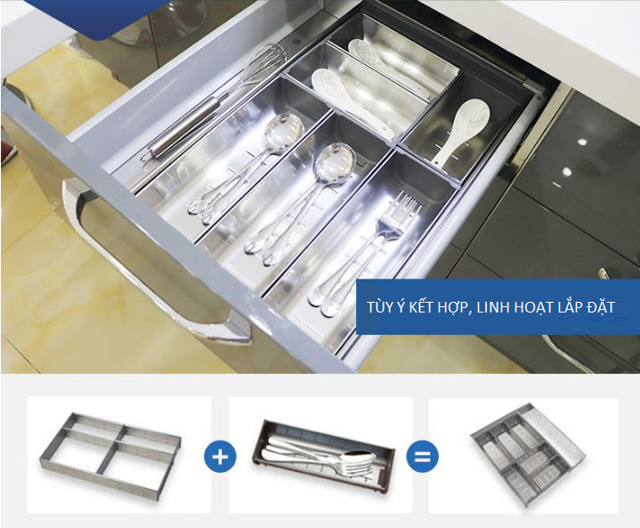 - Phụ kiện tủ bếp: bao gồm các phụ kiện nhỏ như bản lề tủ bếp, ray bi giảm chấn cho tủ bếp, tay nắm tủ cho đến các phụ kiện tổ chức lưu trữ như giá bát nâng hạ, kệ bát cố định, giá xoong nồi bát đĩa; giá gia vị chai lọ; thùng gạo thông minh; thùng rác thông minh; phụ kiện góc tủ bếp inox; tủ đồ khô…