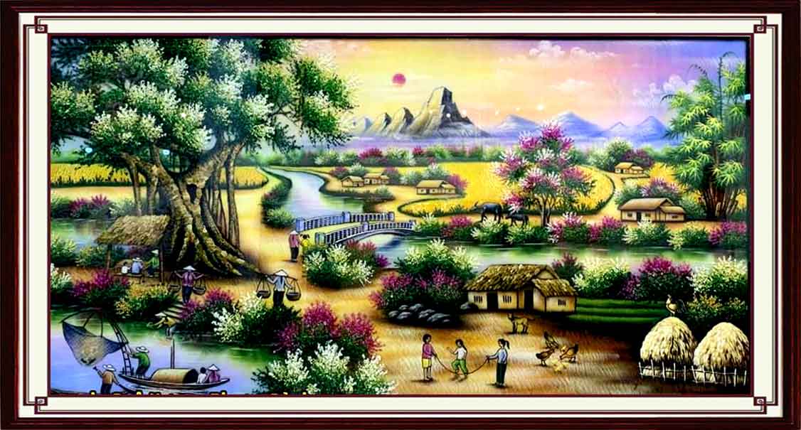Bức tranh phong cảnh làng quê đượm đà, thấm nồng hương lúa thơm trên cánh đồng trải dài. Gốc đa đầu làng với đôi quang gánh, những đứa trẻ đang nô đùa như đem đến thôn quê làng mạc Việt Nam thanh bình, yên ả và trong lành hiện hữu mỗi ngày trong gia đình bạn.